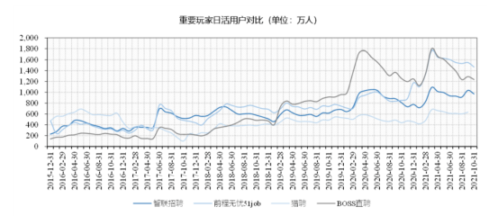 自Boss直聘上线,借助营销吸引求职者加入平台后,更多的雇主自然愿意进驻,也就带来了更多的就业机会,从而吸引更多的求职者,形成了良性循环,目前,已经形成了巨大的求职者与雇主的网络,在日活用户上完成了对同业玩家的赶超。