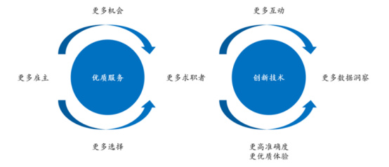 而Boss直聘正是抓住了首发的机会,通过建立其良好的生态圈,构建起求职者与用人端、求职者与技术端两个正向循环,逐渐成长为互联网招聘企业龙头。