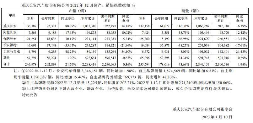 与此同时,产销方面,长安汽车2022年共计生产229.84万辆,同比增长0.36%,累计销售234.62万辆,创下近五年历史新高。总体情况表现亮眼,但长安福特、长安马自达两大合资板块成为公司去年最大的遗憾。