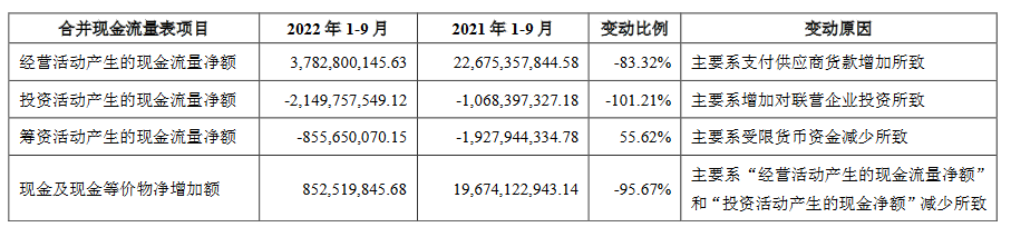 2022年现金流情况依旧严峻。前三季度公司经营活动现金流净额为37.83亿元,同比下降83.32%;筹资活动现金流净额-8.56亿元,同比上涨55.62%;投资活动现金流净额-21.50亿元,同比下降95.67%;现金及现金等价物净增加额为8.53亿元,同比下降95.67%。