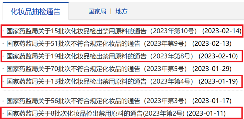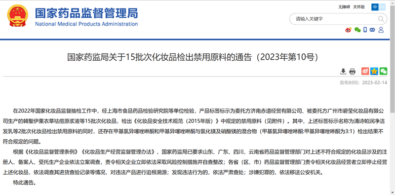 2月14日,国家药品监督管理局公布了《关于15批次化妆品检出禁用原料的通告》。
