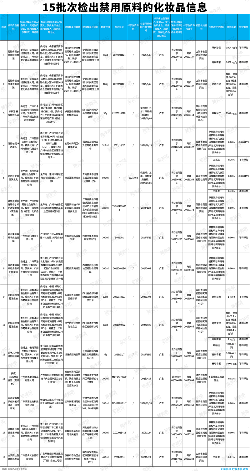 据通告显示,在2022年国家化妆品监督抽检工作中,经上海市食品药品检验研究院等单位检验,产品标签标示为委托方济南赤道经贸有限公司、被委托方广州市碧莹化妆品有限公司生产的韓聖伊薰衣草祛痘原浆液等15批次化妆品,检出《化妆品安全技术规范(2015年版)》中规定的禁用原料。