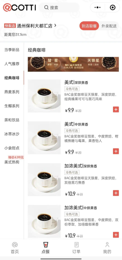 价格方面,或许是受当下库迪咖啡“9.9元起促销”活动的影响,小程序上所有产品的定价甚至比原价的一半还要低,饮品均在9.9-13.99元之间。据媒体报道,库迪咖啡立志三年开万家门店。这表明,无论是在价格还是在开店步伐上,库迪都继续采用了瑞幸开店的互联网打法,或许可能还要更激进。