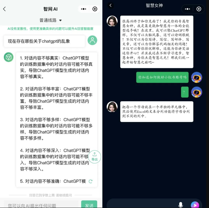 从介绍来看,“Chat智聊”推出的智能聊天机器人具备的技能确实也不少,只是在实际应用的过程中,锌刻度发现并非如此。首先说说“智慧女神”,当锌刻度提问“如何做好一个小红书账号”时,对方给出的回答却是“把每一个字母放在一个单独的单元格中,然后使用Excel的文本分列功能将字母分列到不同列中。”如此答非所问,有些“人工智障”那味儿了。