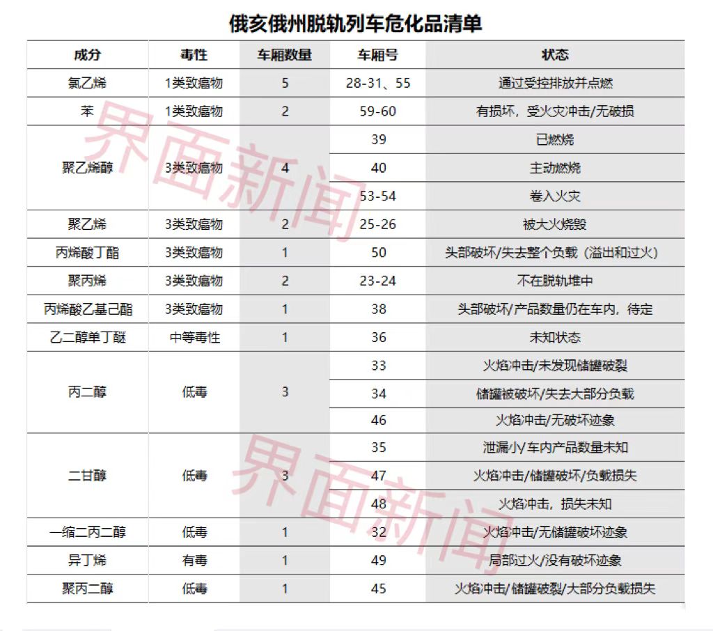俄亥俄州脱轨列车危化品泄露事件仍在发酵。除了令人担心的氯乙烯外,火车上还有多种危化品。