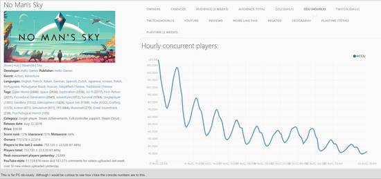 据服务追踪公司GitHyp的数据显示,自从8月12日登录Steam平台之后,这款宇宙探索太空模拟游戏在40天的时间里已经失去了94%的日活跃用户,《无人深空》每小时的玩家数量已经低于1000人,目前在最巅峰的时候,这款游戏每小时最高在线人数也只剩下2000左右的玩家,和首发当日21.2万的优异表现出现了天壤之别。