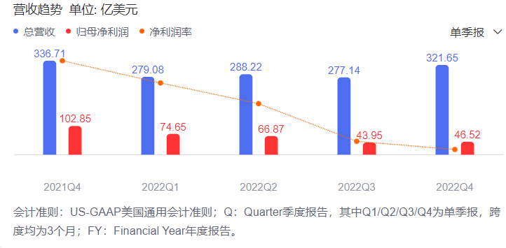 同时,该公司还披露了2022年度业绩,期内实现营收2828.36亿美元,同比增长10%;实现净利润599.72亿美元,同比下降21%;实现每股摊薄收益4.56亿美元,低于去年同期的5.61亿美元。