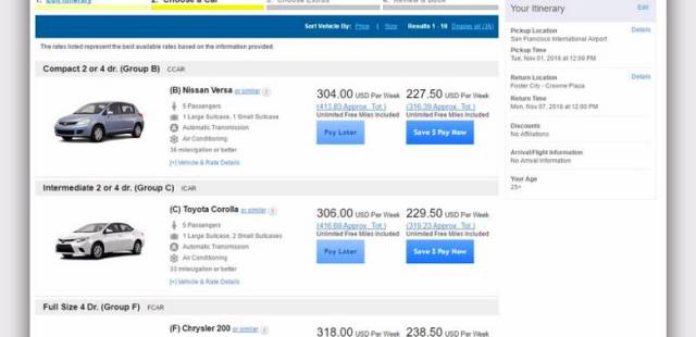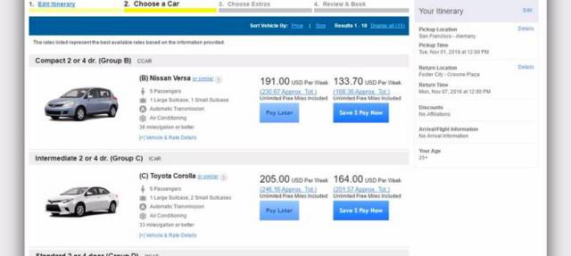 以著名租车公司Hertz网站查询结果为例,如果时间(11月1日到11月7日)一样,换车点一样,但是取车点一个设置在旧金山市区某取车点,另一个设置在旧金山国际机场,那么最便宜的租车总价前者是133美元,后者达到227美元,中间相差近一倍。