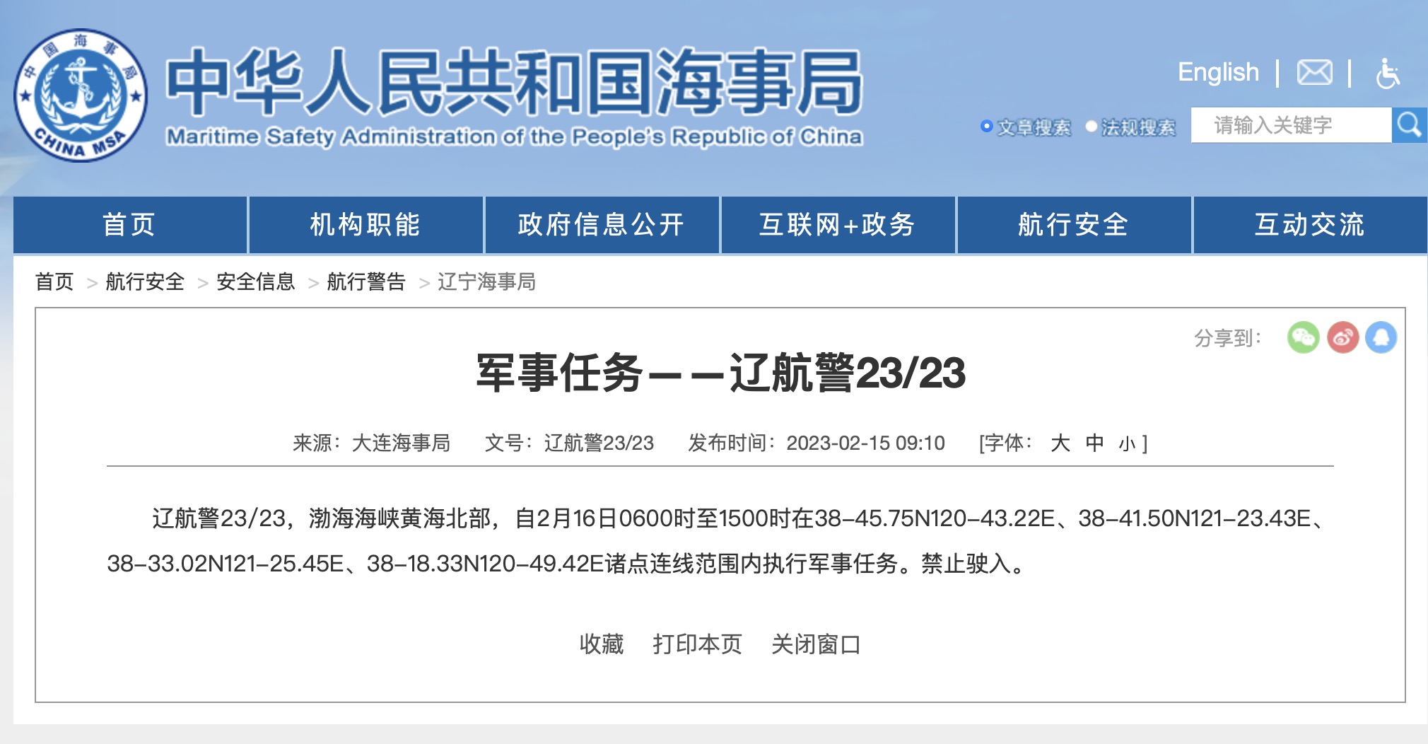 据中国海事局网站2月15日消息,大连海事局发布航行警告,2月16日6时至15时,渤海海峡黄海北部部分海域执行军事任务,禁止驶入。