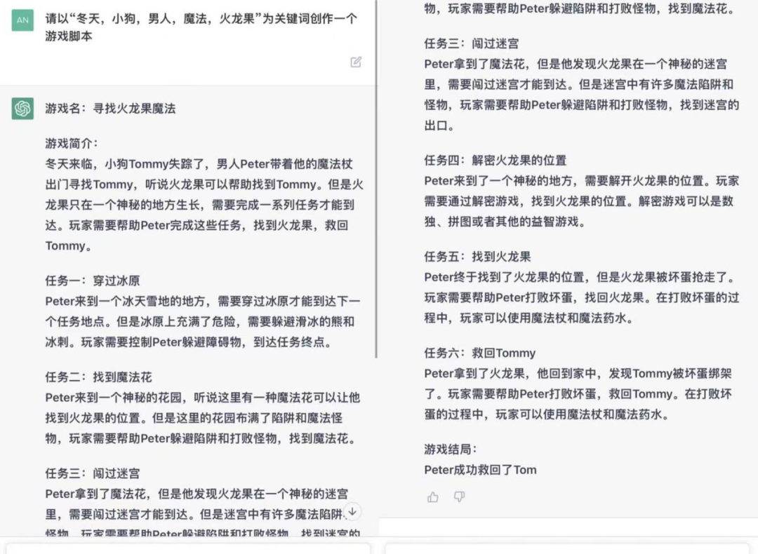 当笔者提问,请以“冬天,小狗,男人,魔法,火龙果”为关键词创作一个游戏脚本时,ChatGPT回答如下,给出了六个关卡任务,乍一看起承转合、颇为像模像样,但仔细一看则会发现细节经不起推敲,“躲避陷阱”“玩家可以使用魔法杖和魔法药水”等语句出现多次。
