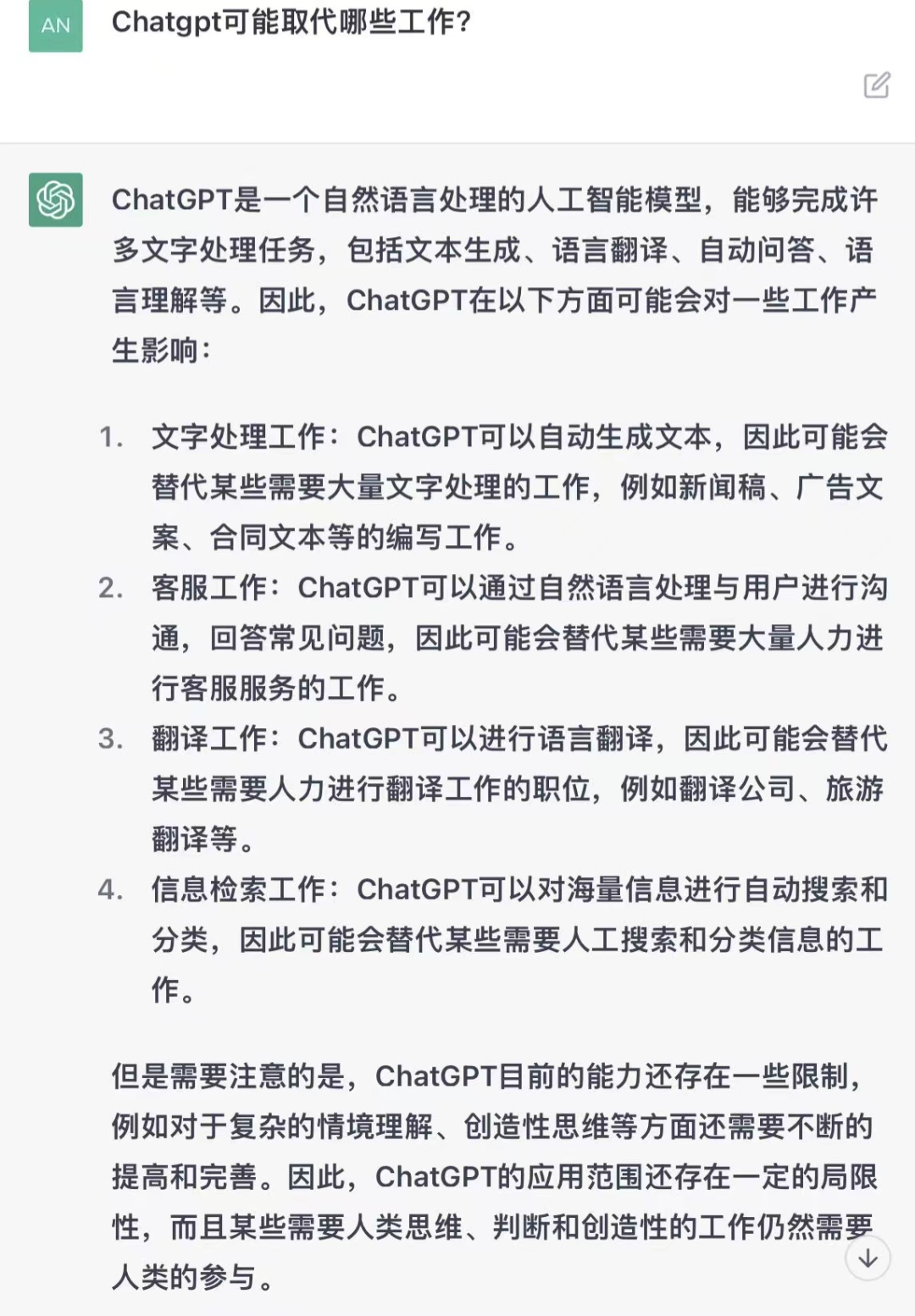 在笔者询问有哪些工作会被它取代时,ChatGPT也肯定了这一点:“需要人类思维、判断和创造性的工作仍然需要人类的参与。”