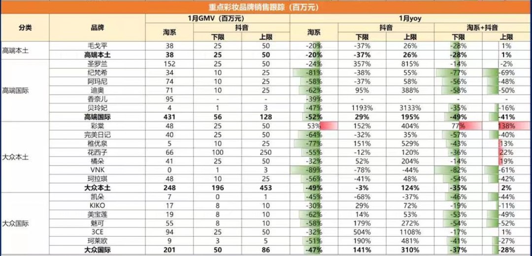 美妆市场其实没有线下商场、专柜、美妆集合店流量暴增所呈现出来的那种热闹,也谈不上所谓的报复性消费。从上个月来看,据魔镜及飞瓜数据统计,1月彩妆品类销量数据普遍下滑明显,尤其是淘系平台被抖音分流,护肤及彩妆品类的销售数据同比降幅均达到40%左右。