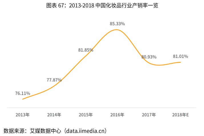 根据艾媒数据中心2019年的化妆品行业数据分析,2018年及2019年中国化妆品产量增速明显,2018年产量117万吨,预计2019年产量将达124万吨,供大于求的状况明显加剧。而且从行业产销率来看,这几年我国化妆品行业产销率均在75%-85%之间,并在一定程度上有上涨的趋势。
