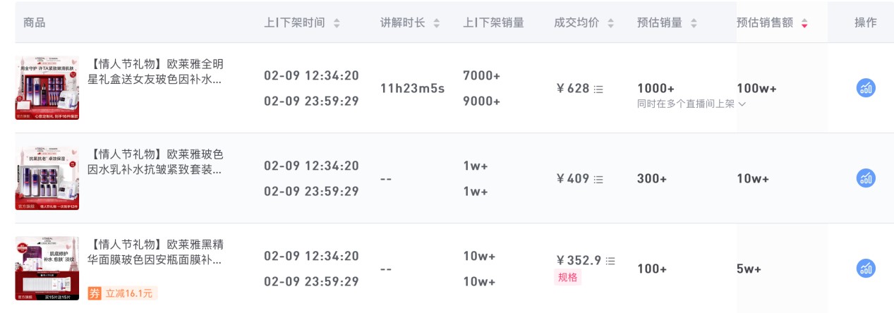 根据灰豚数据美妆品牌的直播状况,以欧莱雅为例,截至2月12日的7天内,欧莱雅的最高直播销售额在2月9日 ,共 200w+ 元,获得27.4w观看人次。从图中可看,欧莱雅的全明星礼盒在多个直播间里的总预估销量为1000+,预估销售额为100w+。