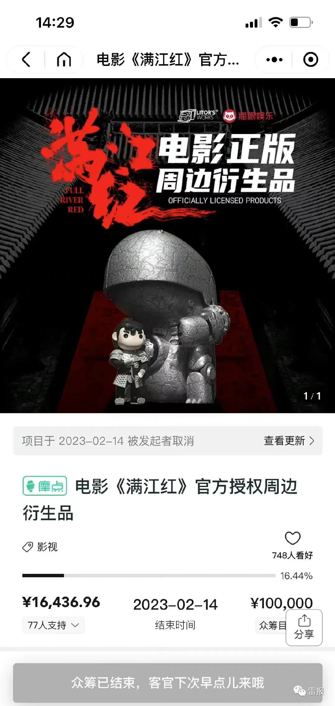 2月14日,话题#满江红周边下架#登上微博热搜,目前阅读次数高达4.1亿,讨论次数达到了3万。据了解,被网友热议的《满江红》周边众筹项目从正式开启到结束(被发起者取消),时间不到一天。另据网络截图,该项目下线时的累计众筹金额不到2万(77人支持),这样的表现与在春节档及国产影片票房总榜上均居于其后的科幻电影《流浪地球2》相比,情况显得有些惨烈。