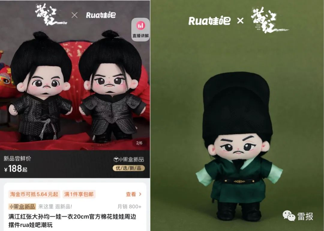 其实《满江红》的周边不止这一项,此前Rua娃吧也推出了该部电影的棉花娃娃周边,角色为张大(沈腾饰)和孙均(易烊千玺饰),单价188元,当前Rua娃吧天猫旗舰店该系列产品月销800+,链接中包含的角色何立(张译饰)的棉花娃娃则为该品牌在晚些时候推出的产品,目前虽然可加购,但尚未开售。