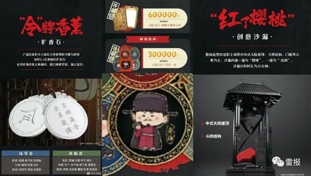 此次众筹包含产品有“令牌香薰”(扩香石)、“红了樱桃”(创意沙漏)、这是把“诡刃”(闪存盘)、满江红潮流版画、联名款机甲。此外当众筹金额达30万元可解锁赠品《满江红》书签一套,达60万可解锁赠品《满江红》御赐令牌款卡包,至100万元的解锁赠品未公开。