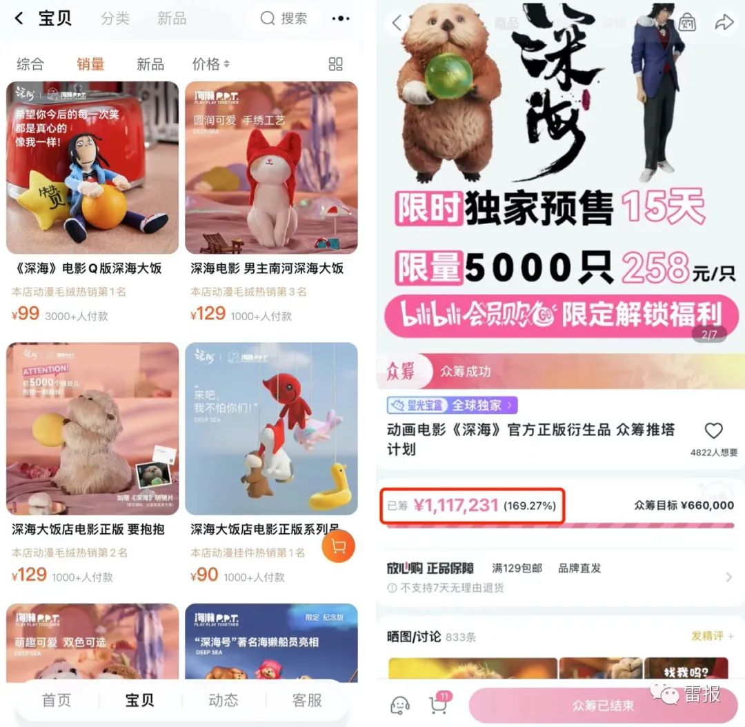 另外,《深海》在B站进行的一项正版衍生品众筹(已结束)活动也筹得了111.72万元,众筹目标为66万。雷报此前从《流浪地球2》周边众筹过亿的话题切入,统计过造点新货、摩点、B站等几大平台的国产IP众筹项目,当时提到“百万众筹项目”已算是非常优秀的成绩,因为千万级别的很少,亿元层级,《流浪地球2》应该是第一个。可见《深海》的周边众筹成绩还是比较不错的。