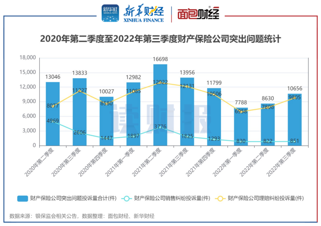 通报显示,2022年第三季度,在涉及财产保险公司投诉中,理赔纠纷9805件,占财产保险公司投诉总量的80.35%;销售纠纷851件,占比6.97%。