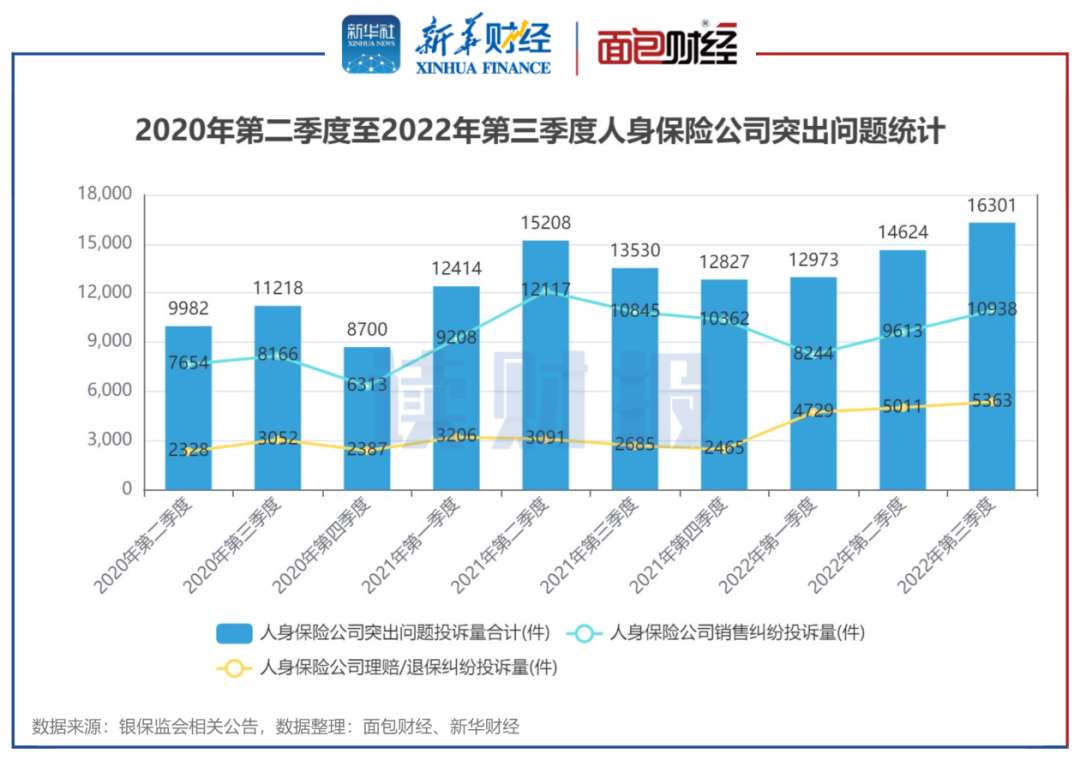 通报显示,2022年第三季度,在涉及人身保险公司投诉中,销售纠纷投诉为10938件,占比为53.3%;退保纠纷投诉为5363件,占该季度人身保险公司投诉总量的26.13%。