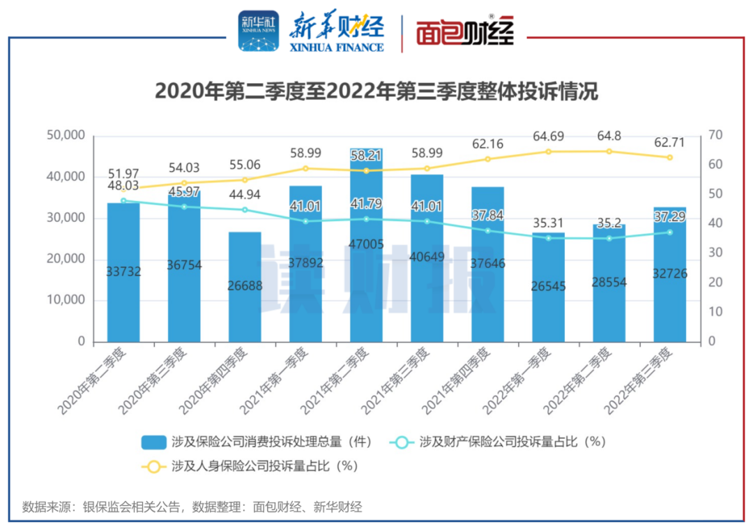 从保险公司的类型来看,2022年第三季度,涉及财产保险公司投诉12203件,占投诉总量的37.29%;人身保险公司为20523件,占总量的62.71%。