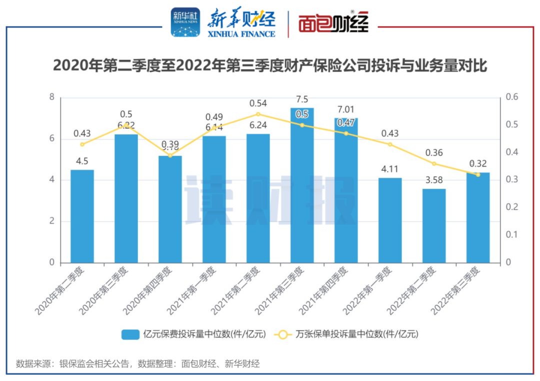 其中,2022年三季度财产保险公司亿元保费投诉量中位数为4.37件/亿元,较2022年二季度微升0.79件。