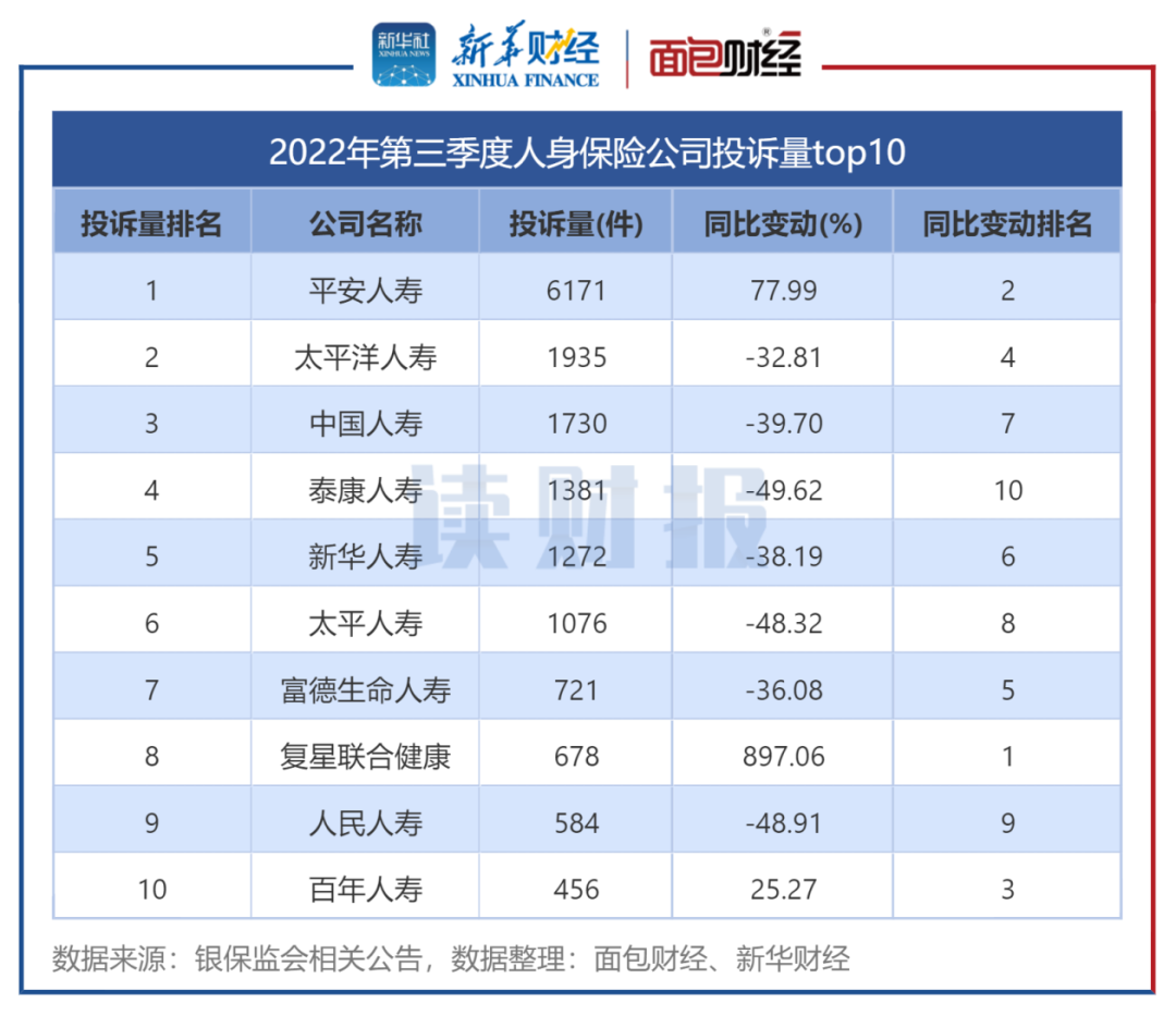 2022年第三季度,人身保险公司中,平安人寿、太平洋人寿、中国人寿、泰康人寿和新华人寿的投诉量排名前五,5家公司的投诉量分别为6171件、1935件、1730件、1381件和1272件。值得注意的是,除平安人寿2022年第三季度投诉量同比上涨外,其他4家人身险公司该季度投诉量同比均有所下降。