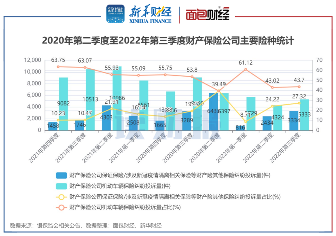 从险种来看,财产保险中机动车辆保险纠纷投诉较多。2022年三季度,机动车辆保险纠纷投诉达5333件,占财产保险公司投诉总量的43.7%;涉及新冠疫情隔离相关保险等财产险其他保险纠纷3334件,占比27.32%。