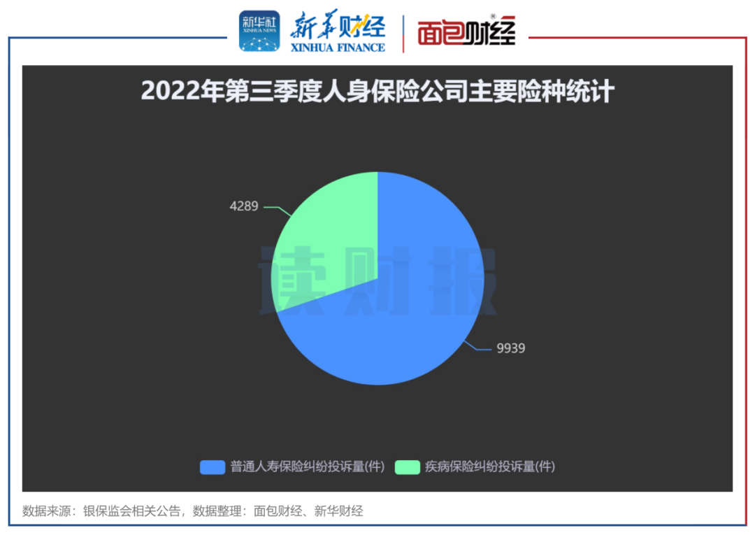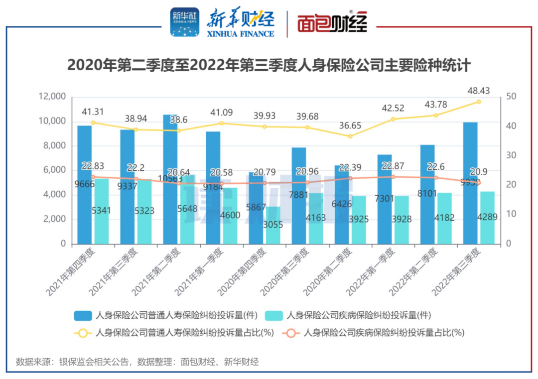 数据显示,2022年第三季度,在涉及人身保险公司投诉中,普通人寿保险纠纷投诉为9939件,较2022年二季度上升1838件,环比上升22.69%;占人身保险公司季度投诉总量的48.43%,较2022年二季度占比微增4.65个百分点。