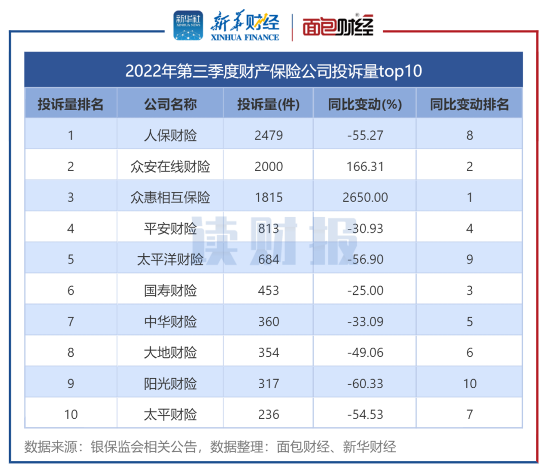 通报数据显示,2022年第三季度,财产保险公司中,人保财险、众安在线财险和众惠相互保险位列前三,投诉量分别为2479件、2000件和1815件。平安财险和太平洋财险分列第四、第五位,第三季度投诉分别为813件和684件。除中小险企众安和众慧外,排名前十的其它财险公司2022年第三季度投诉量均同比下降。