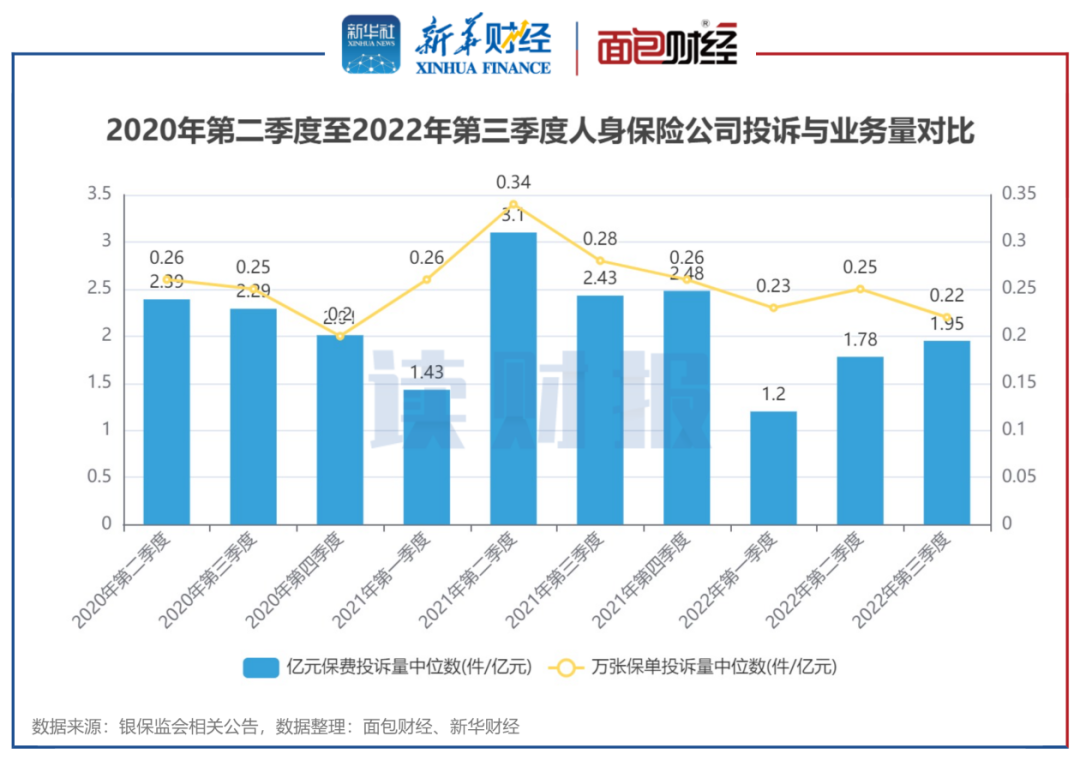 图11:2020年第二季度至2022年第三季度人身保险公司投诉与业务量对比