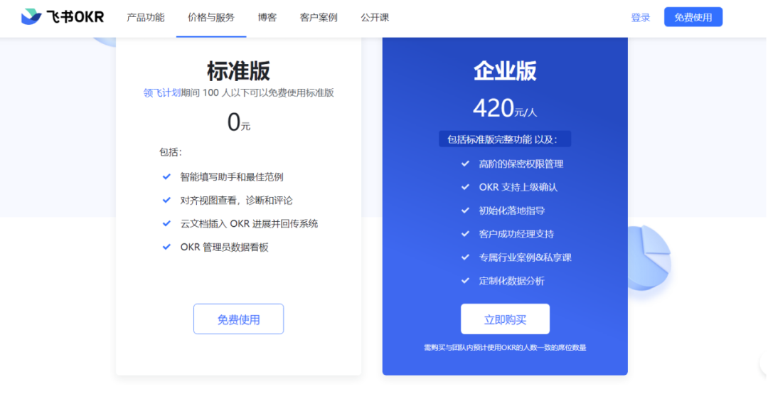 飞书OKR企业版的收费标准是一年420元/人。但作为三巨头里体量相对最小的,飞书在另外两位加速商业化的时候,没有放弃对用户的扩展。目前,飞书People标准版将面向中小企业免费开放,并为百人以下企业免费提供飞书OKR标准版,用来吸引一部分客户迁移。