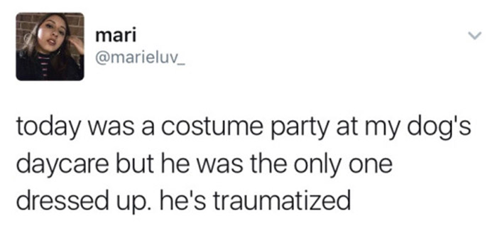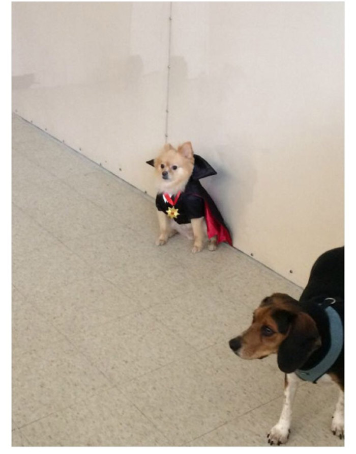 我们都曾经觉得自己与周围的人群格格不入,而狗狗们也会面临这样的困扰。一位主人就发布了这样一张照片:这天,她家狗狗的托管所里举办了一场变装派对,而当她牵着狗狗盛装出席时却发现,自己的狗狗成了全场唯一一个乔装打扮过的狗狗:“他幼小的心灵受到了伤害。”