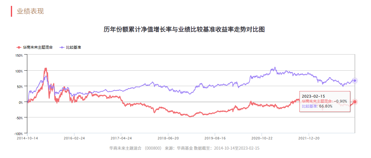 然而,成立至今超过8年(截至2023年2月15日),华商未来主题混合仍累计浮亏0.9%,同类排名372/377,表现垫底。相较业绩比较基准,该产品成立以来累计跑输超过65个百分点。