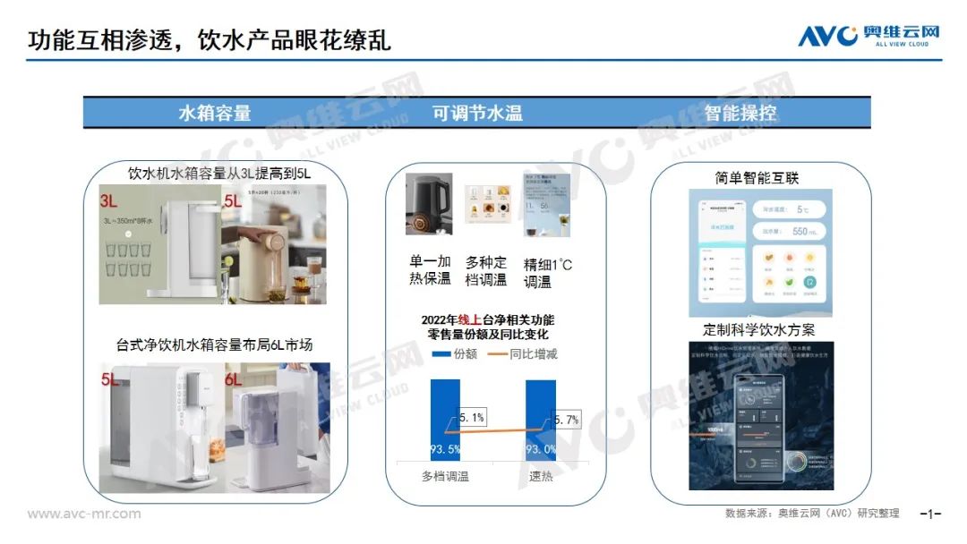 水箱容量:“大”正在成为行业趋势和主流。即热式饮水机的水箱容量中3L为主流产品,有部分产品开始涉及5L大水箱容量;根据奥维云网(AVC)线上监测数据,台式净饮机的水箱容量主流为5L,6L的水箱线上零售量份额从9.7%提升到13.4%;电水壶的水壶容量从1.7L、2L提升到5L大容量。满足家庭饮水使用的情况下,可接受的“大”容量是整体饮水产品共同的发展趋势。