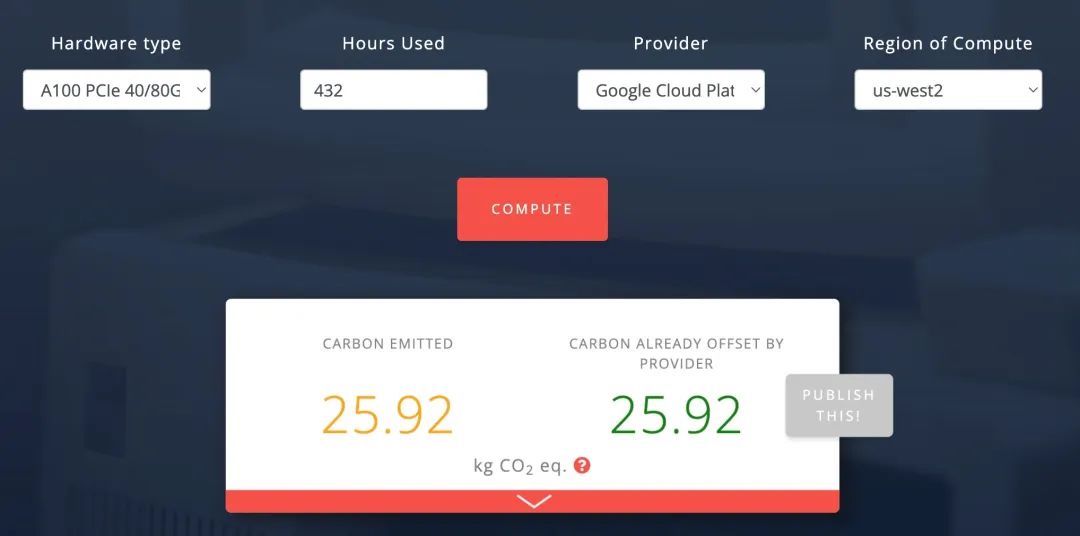 使用ML CO2 Impact计算器,我们可以估算ChatGPT的每日碳排放为25.92 kg,如下: