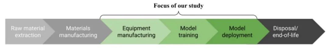 虽然生命周期评估 (LCA)法通常是评估产品从摇篮到坟墓的整个阶段的碳排放,这将考虑到原材料提取的所有过程对环境的影响。但此次对于ChatGPT的评估是仅专注于从制造设备到模型部署运行,如下图。