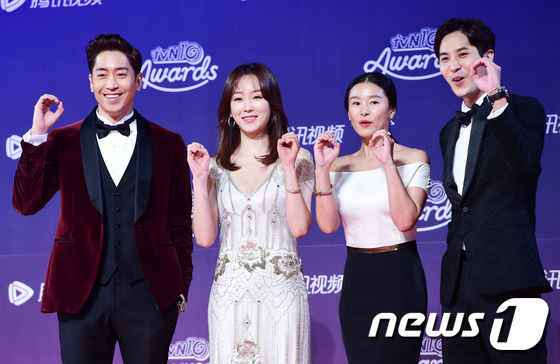 口碑剧《Signal》主演合影。左二:赵震雄;右二:金惠秀。