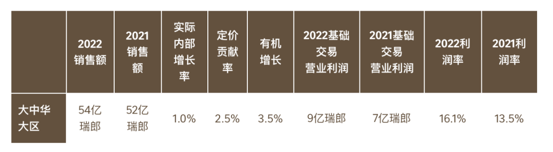 财报显示,2022年,雀巢大中华大区的基础交易营业利润为9亿瑞郎,折合人民币63.6亿元(注:根据雀巢财报汇率计算),基础交易营业利润率达到16.1%。“大中华大区的基础交易营业利润率增加了260个基点。有利的产品组合和严格的成本控制抵消了成本通胀带来的影响。”该公司称。