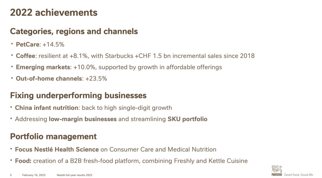 得益于大多数地区和品类的广泛增长,2022年有机增长率达到8.3%,其中定价贡献率提高到8.2%,反映了显著的成本通胀。发达市场的有机增长率为7.1%,主要受定价推动。新兴市场的有机增长率为10.0%,得益于价格提升和实际内部增长。