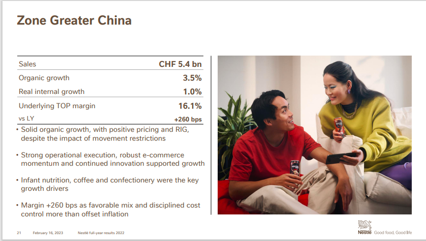 在刚刚结束的业绩沟通会上,施奈德表示,去年四季度的疫情让中国市场“受到了一些影响”。雀巢CFO Fran ois-Xavier Roger则形容,大中华区在疫情和有限度的通胀的背景下,2022年录得了中个位数的增长,“显示出了业务韧性”。