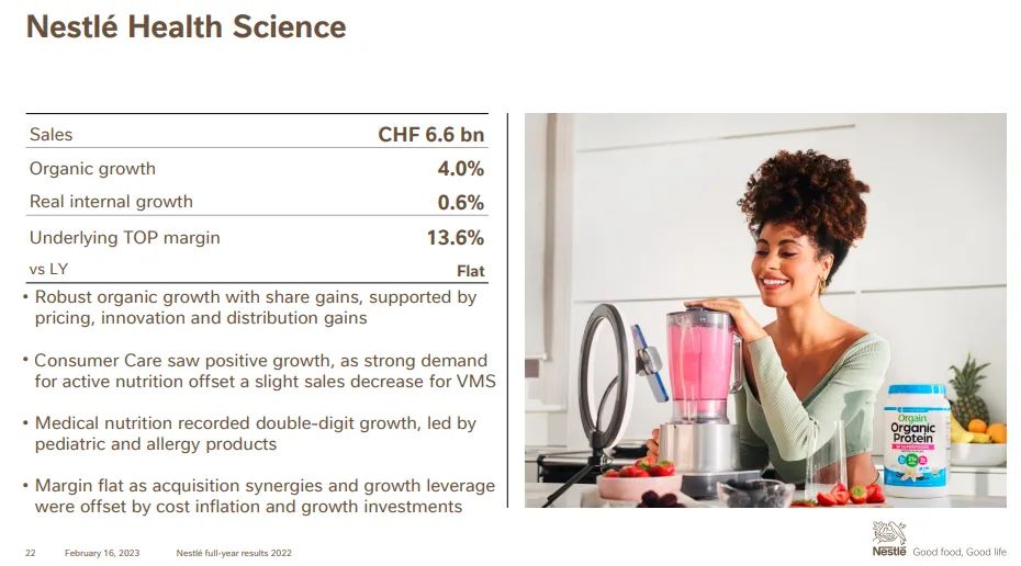 另外,小食代翻阅的业绩资料显示,2022年,雀巢健康科学销售额增长36.9%至66亿瑞郎,有机增长为4.0%(其中实际内部增长0.6%),反映出对医疗营养品和健康老龄化产品的需求。