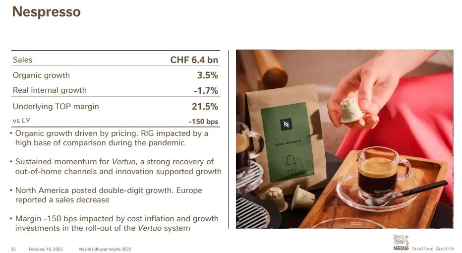 资料显示,Nespresso浓遇咖啡销售额为64亿瑞郎,有机增长3.5%(其中受到疫情期间增长带来的高比较基数影响,去年实际内部增长下滑1.7%,所以有机增长主要由定价因素贡献)。