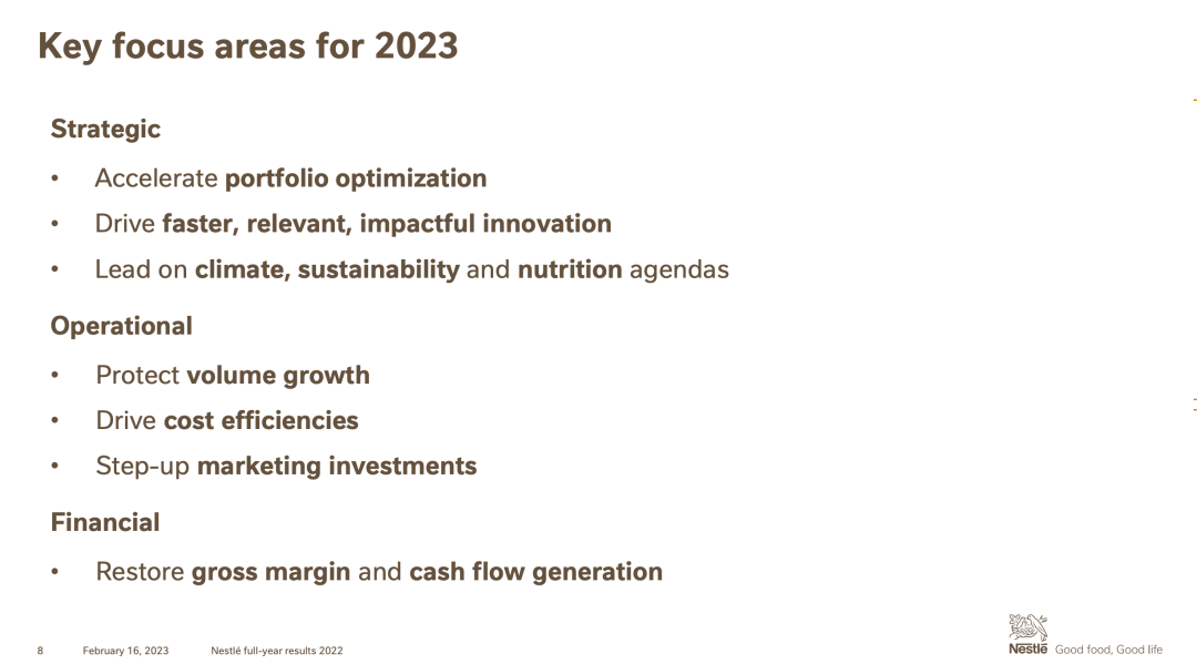 展望2023年,雀巢今天表示,致力于6%至8%的销售额持续有机增长。基础交易营业利润率(UTOP)在17.0%到17.5%之间。按固定货币计算的每股基础收益预计提高6%至10%。