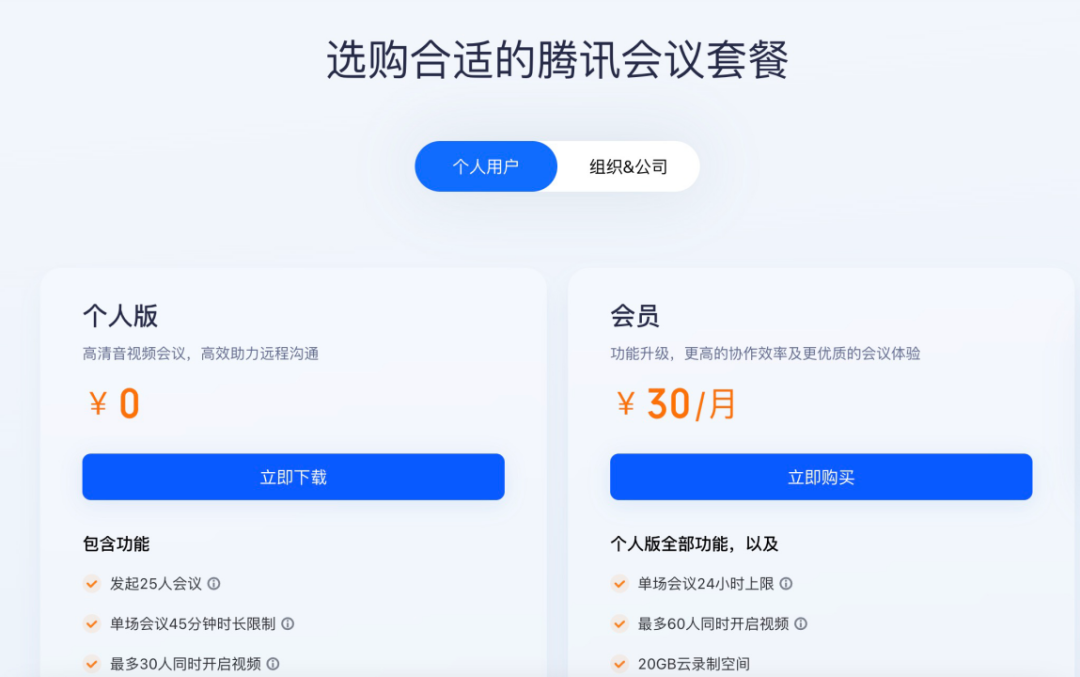 而这也是腾讯会议从去年宣布开始收费的原因。从去年9月15日起,用户使用腾讯会议部分功能需至少支付1个月的费用。针对于个人用户,腾讯会议分为四种不同收费价格,分别是连续包月25元、1个月30元、3个月88元和1年288元。
