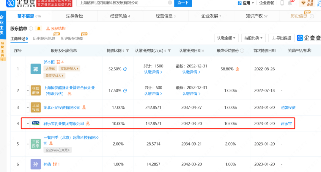 工商资料显示,酪神世家成立于2022年3月21日。郭本恒为其大股东及实际控制人。2007年至2015年,郭本恒曾任光明乳业股份有限公司总经理、党委副书记等职务,2015年因涉嫌受贿罪,在2016年判处有期徒刑六年。