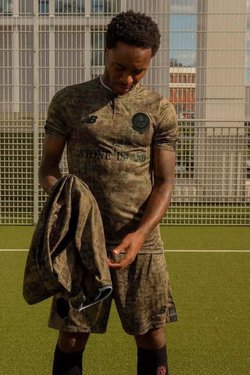 新款设计将足球鞋日常化,足球服套装采Stone Island原创迷彩图样,裤子及T恤由100%可回收聚酯纤维制成,正面印有Stone Island矽胶徽章及NB标志,并提供简约黑色足球袜配件。(信息来源:官方微信)