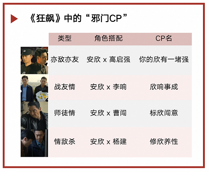 对于《狂飙》的爱好者来讲,鲜少能够逃过以安欣为轴心的CP大乱炖:安欣和李响、安欣和高启强、安欣和张彪、安欣和杨健,不同的人物关系、不同的选择让人物故事张力满满,让观众欲罢不能。除此之外,高启强和陈书婷、和高启盛之间的爱情、亲情也成为很多人的磕点。