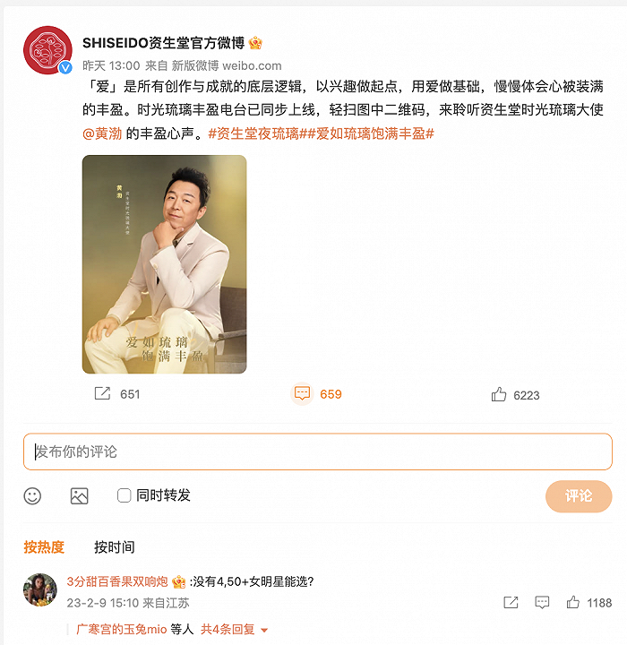 2月9日,黄渤官宣美妆类新代言:资生堂旗下“贵妇线”时光琉璃系列大使。围绕他的声音却充满了不赞同:一张喜剧小人物的脸孔,似乎很难完美让大众相信美妆产品的功效。高度不适配,成了这组娱乐营销留给人最深刻的印象。