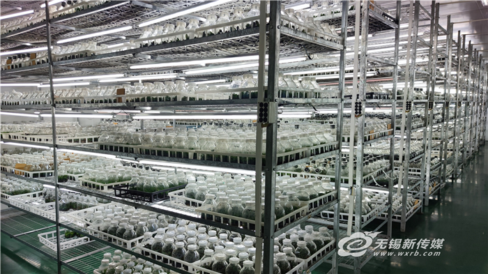 相比水上的热闹场面,江苏东郁植物科技有限公司则显得有些安静,但就在这片安静中,新一年的花卉育苗工作早就悄悄开始了。在生产间里,6位穿着白大褂的工人正在操作台前小心翼翼地进行兰花带芽组织的切分工作。“这后面有个芽,在这里横着切一刀更好……”公司经理胡春宏边指导工人边介绍说。这里采用的是组培技术,利用植物的休眠芽培养后种到培养基上,在人工控制的条件下进行培养,使其生成完整的植株。就拿蝴蝶兰来说,取下其开花株花梗上的休眠芽,将休眠芽经过表面消毒后,再放入配置好营养液的玻璃瓶内,打破它的休眠,将花芽变成叶芽,长出叶芽后再把叶芽分割开来增殖到一定数量,符合计划排单量后就进入生产计划,再进行扩量、长个、生根。在工厂化的生产情况下,一个工人一天可以分割1500至2000棵种苗。